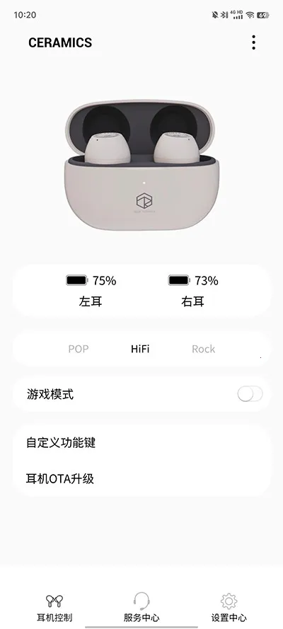 4、功能多样:点击开始添加按键,选择耳机连接,能查看耳机电量与播放模式,还可在自定义功能键设置触摸功能键,服务中心提供全方位支持服务。