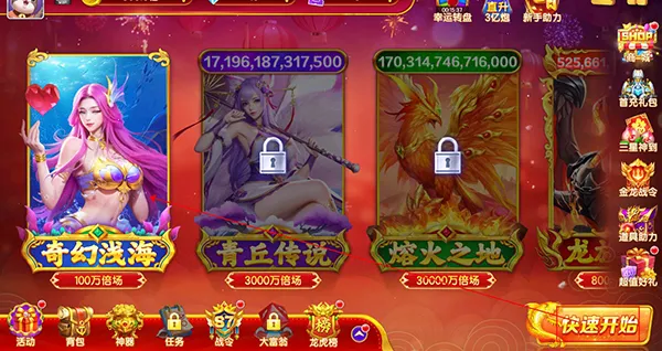进入游戏后,可以点击右下角的“快速开始”,进入捕鱼房间捕鱼,也可以自己选择倍数场开始捕鱼。