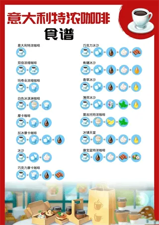 冰拿铁咖啡:拿铁咖啡+牛奶+冰块+巧克力糖浆+香草糖浆